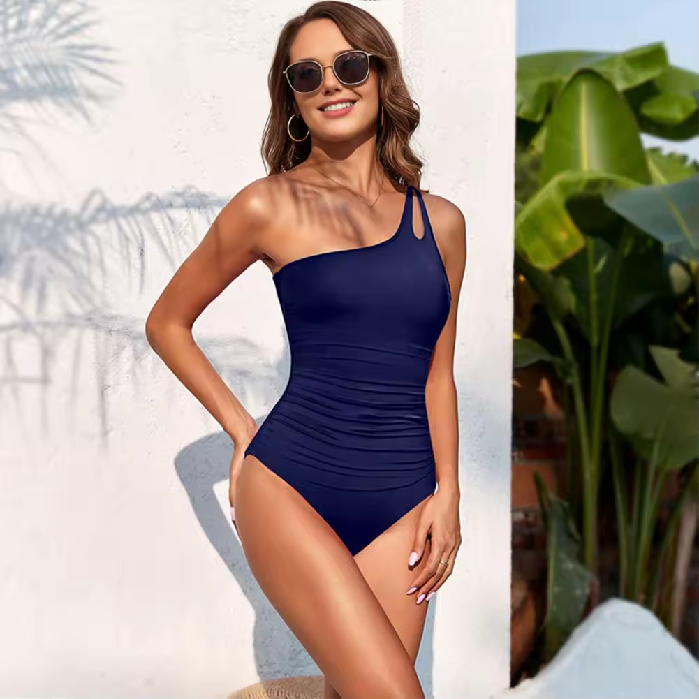 Avec sa coupe asymétrique à une épaule et ses plis élégants sur l’abdomen, ce maillot offre un look moderne et raffiné qui attire tous les regards. Sa conception flatteuse met en valeur la silhouette sans compresser, pour un style qui se remarque autant sur la plage que lors de vos photos de vacances.