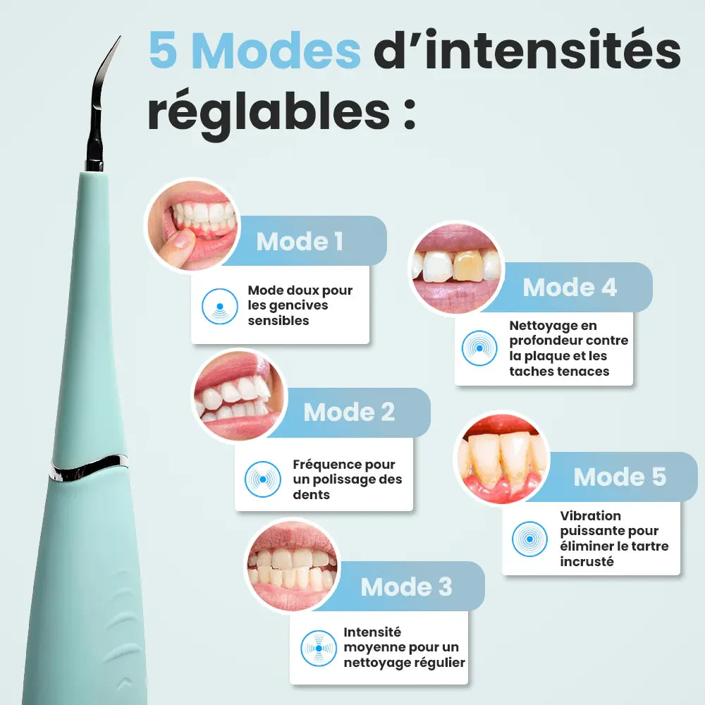 🦷 5 niveaux d'intensité réglables pour un confort sur-mesure