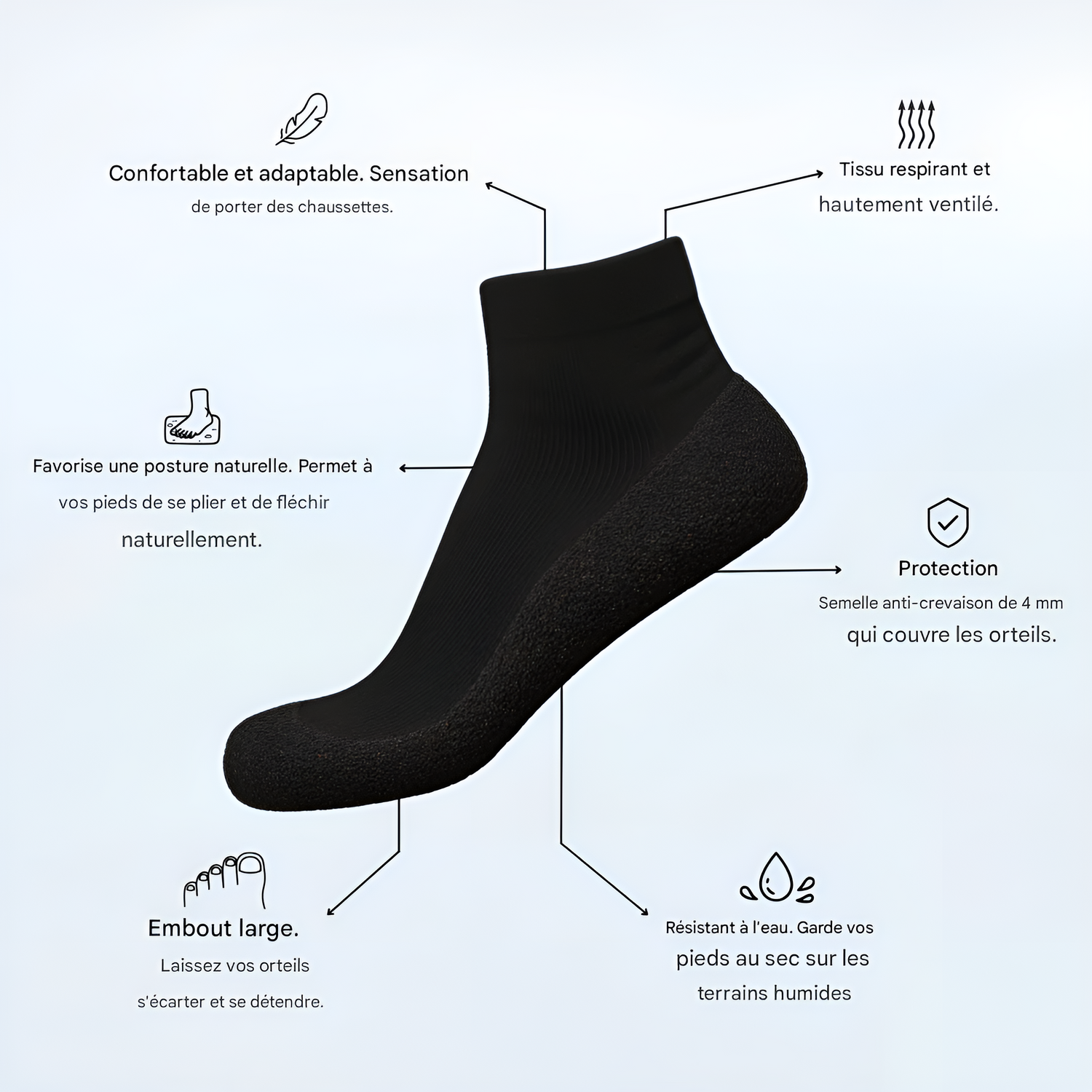 N'aimez-vous pas cette sensation de marcher avec des chaussettes aux pieds ? Imaginez si vous pouviez ressentir ce confort partout où vous allez. Dites bonjour à FlexiSocks™ – la combinaison parfaite de confort, de protection et de polyvalence.