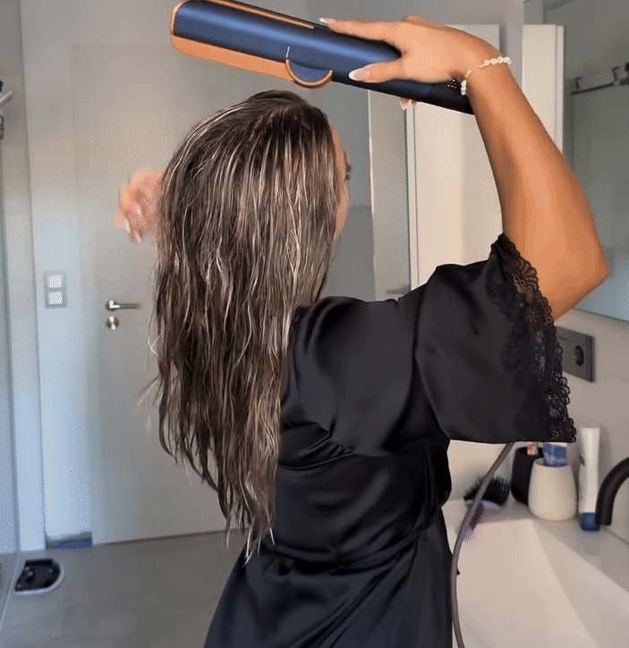 Tout dépend de ta longueur et de ton volume, mais en moyenne entre 5 et 10 minutes suffisent pour un résultat impeccable. Un vrai gain de temps pour les matins pressés !