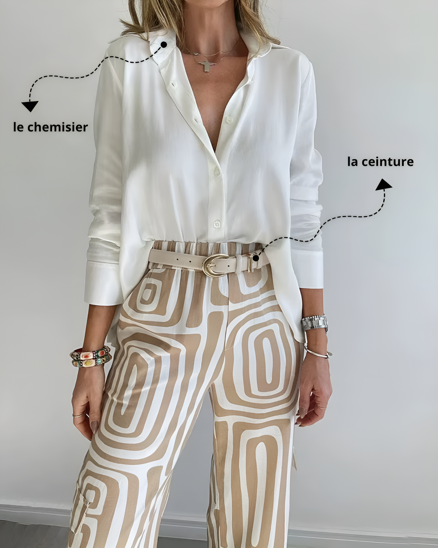 Cet ensemble allie style et bien-être, pour vous sublimer tout en vous offrant un confort absolu. Le chemisier blanc classique, avec ses manches longues et sa coupe droite flatteuse, incarne l’élégance intemporelle. Son col discret apporte une touche de sophistication. Et la meilleure partie ? Il est actuellement offert à l’achat du pantalon.