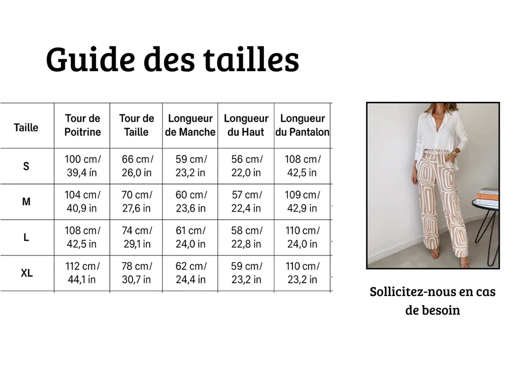 Pour un temps limité, à l’achat des pantalons, vous recevez gratuitement le chemisier et la ceinture assorties.