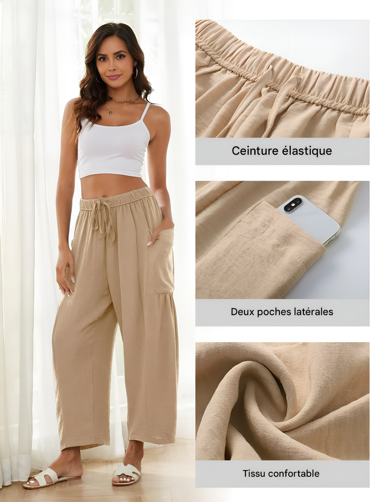 Ces pantalons s’agencent avec tout : camisoles, t-shirts, vestons ou même maillots pour la plage. Disponibles en plusieurs couleurs unies, ils sont parfaits pour créer des looks variés, que ce soit pour une sortie décontractée ou une journée relax à la maison. Un indispensable polyvalent dans ta garde-robe d’été!